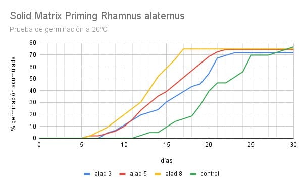 En las gráficas que obtenemos, se pueden ver claramente las diferencias: la línea verde representa las semillas sin ningún tratamiento, mientras que las otras líneas muestran el efecto de diferentes métodos de solid matrix priming. Este proceso consiste en exponer las semillas a ciertas condiciones controladas para acelerar y sincronizar su germinación. La línea amarilla refleja el tratamiento más efectivo que hemos conseguido hasta ahora, pero aún hay margen de mejora. Observamos pistas que nos indican que podemos ajustar ciertos detalles para que esa curva amarilla se desplace más hacia la izquierda, es decir, para lograr que las semillas germinen aún más rápido y de forma más homogénea.