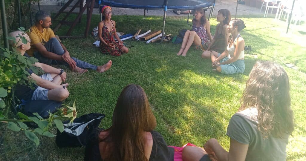 In the morning, we held a deep ecology workshop inspired by “work that reconnects.” Around ten participants reflected collectively on the emotions stirred by the current state of the world and how we can transform pain and concern into active commitment to life.