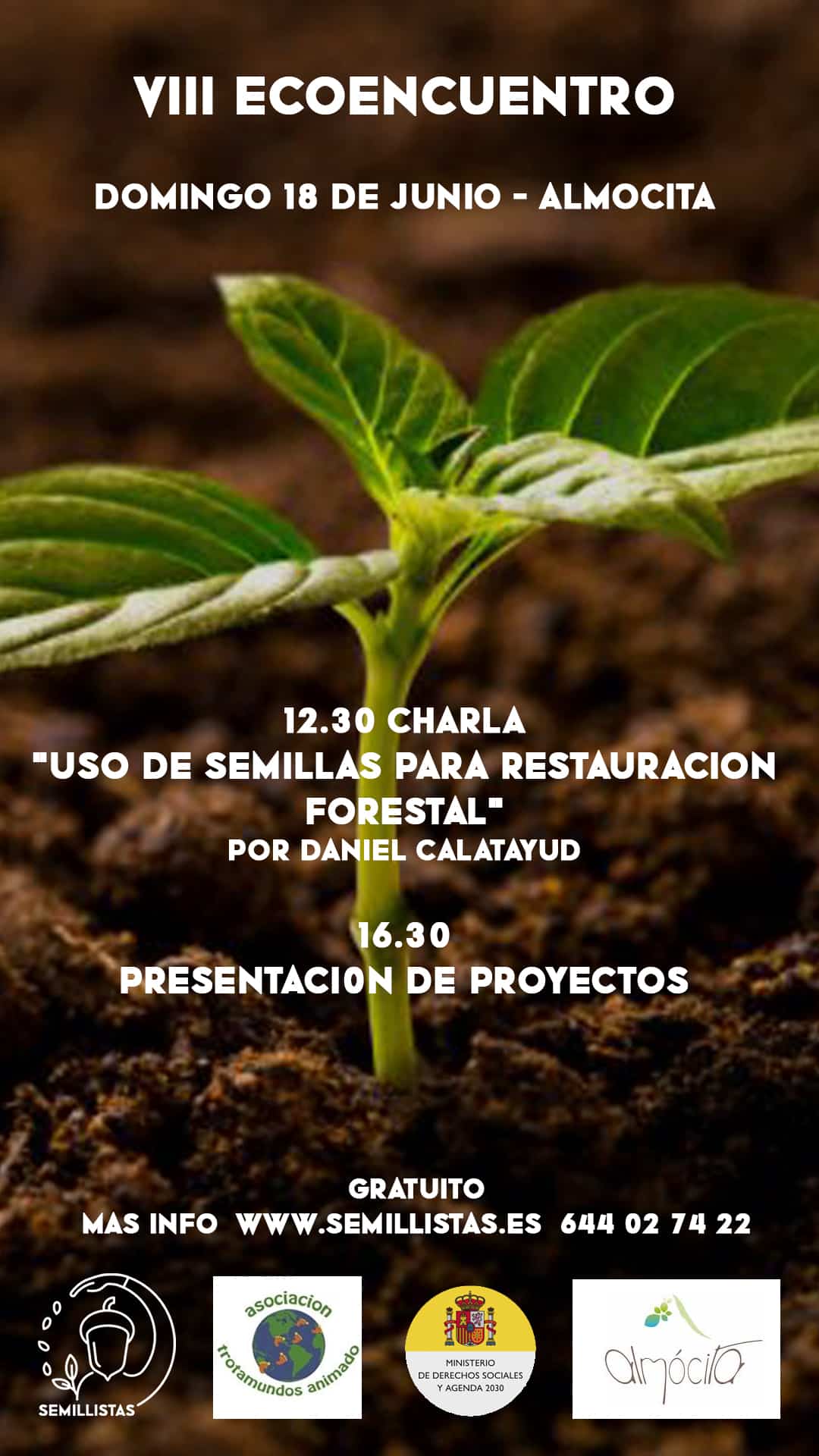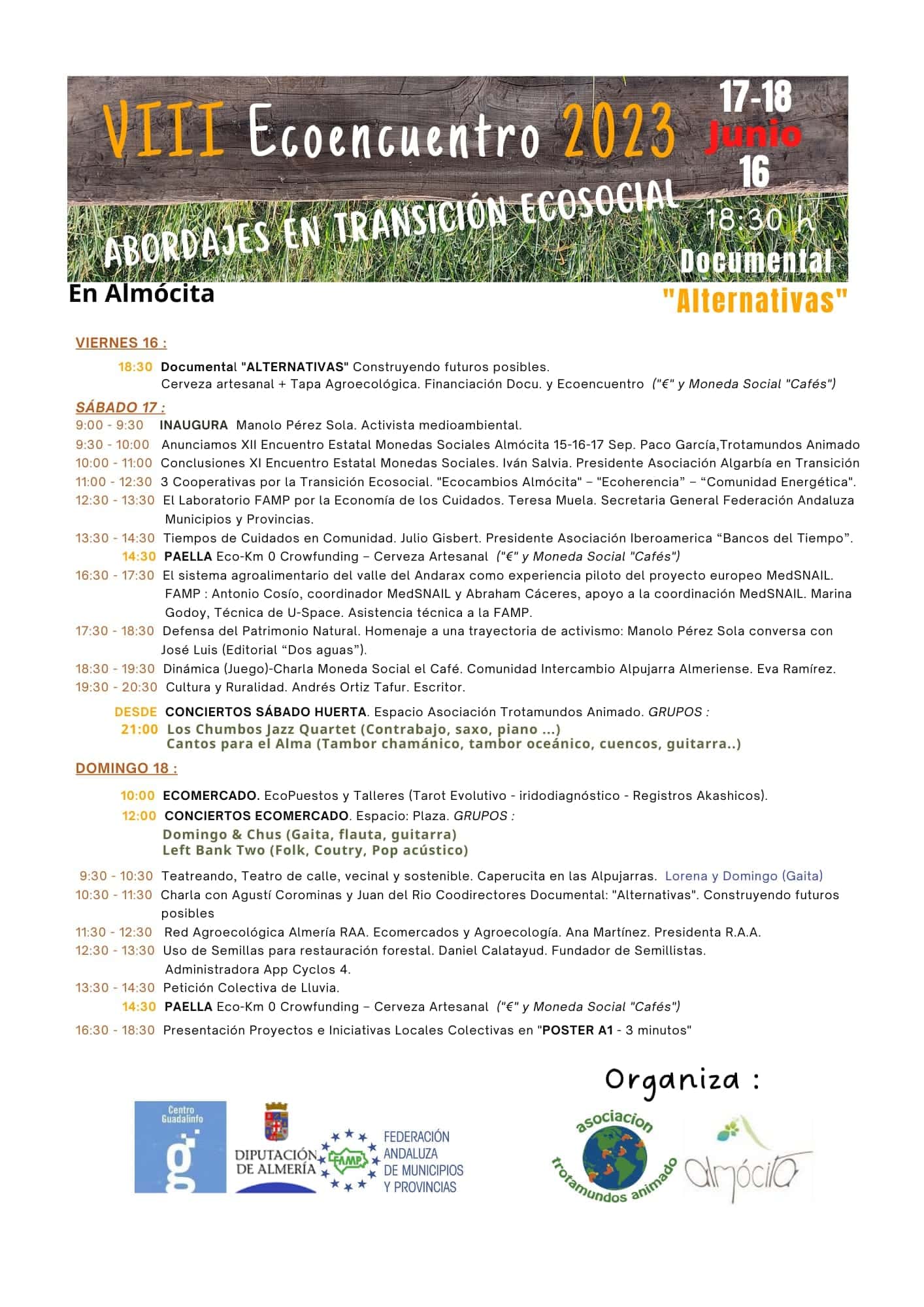 Este domingo 18 de Junio estaremos en Almocita en el VIII Encoencuentro este año con el título “Abordajes en Transición Ecosocial” que organizan l@s compañer@s de Asociación Trotamundos Animado. Tenemos muchas ganas de compartir esta magnifica jornada, estaremos a las 12.30 ofreciendo la charla “Uso de semillas para restauración forestal” y a las 16.30 participando en la “Presentación de proyectos”.