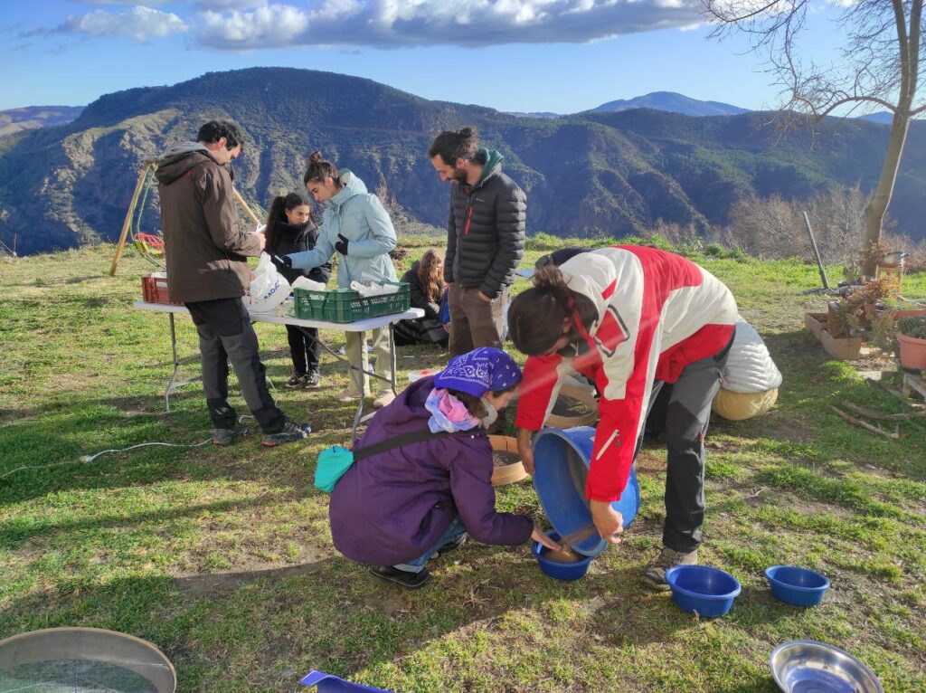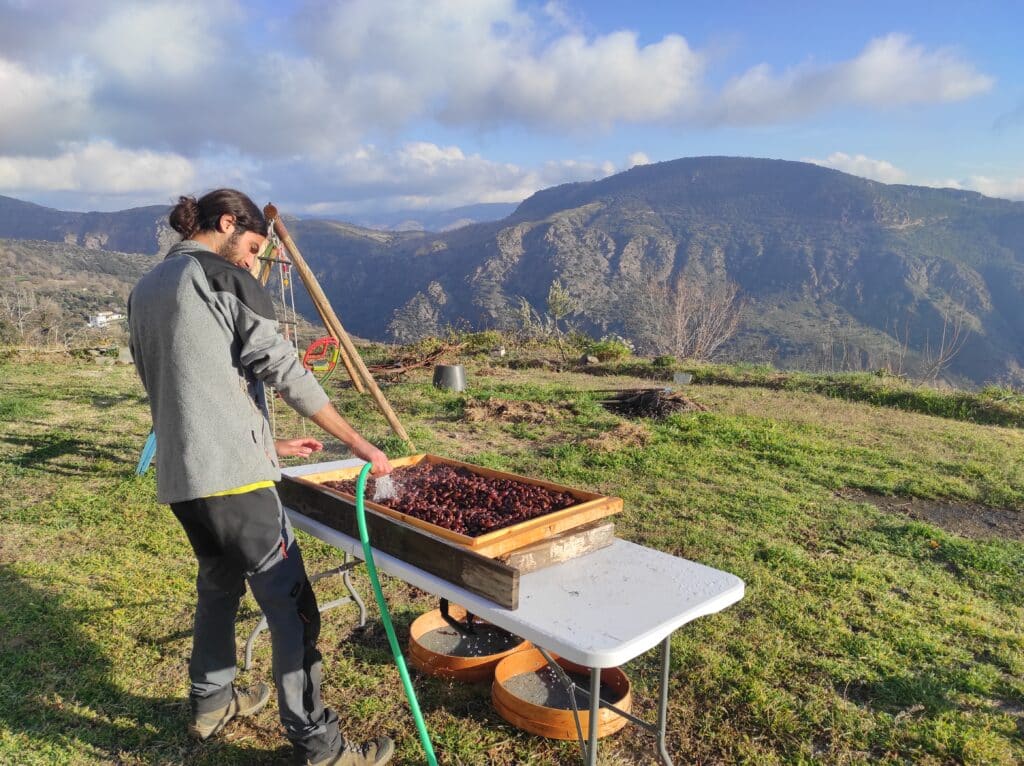 El proceso comenzó en Sierra Lujar, donde recolectaron tierra y raíces de las especies con las que estamos trabajando. Ya en el laboratorio, cribamos la tierra para obtener un tamaño de partícula adecuado para hacer el film coating y trituramos las raíces con el mismo propósito. Luego, utilizamos este material para hacer un recubrimiento sobre las semillas, lo que facilita la simbiosis entre ellas y los hongos micorrícicos presentes en su ecosistema original.