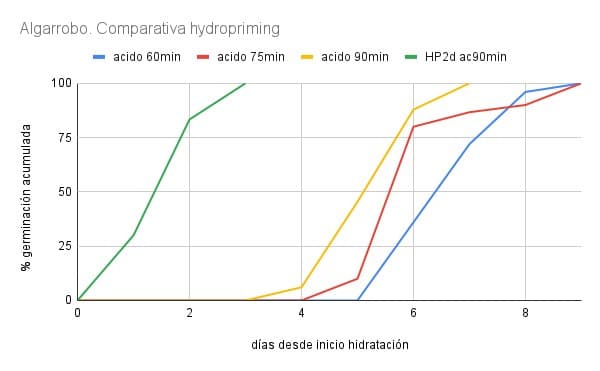 Comparando semillas tratadas con hidropriming frente a semillas sin tratamiento, observamos una reducción drástica en los tiempos de germinación. Sin tratamiento, la germinación puede tardar entre 4 y 7 días, mientras que con hidropriming ocurre en 1 a 3 días. Esto tiene varias ventajas: