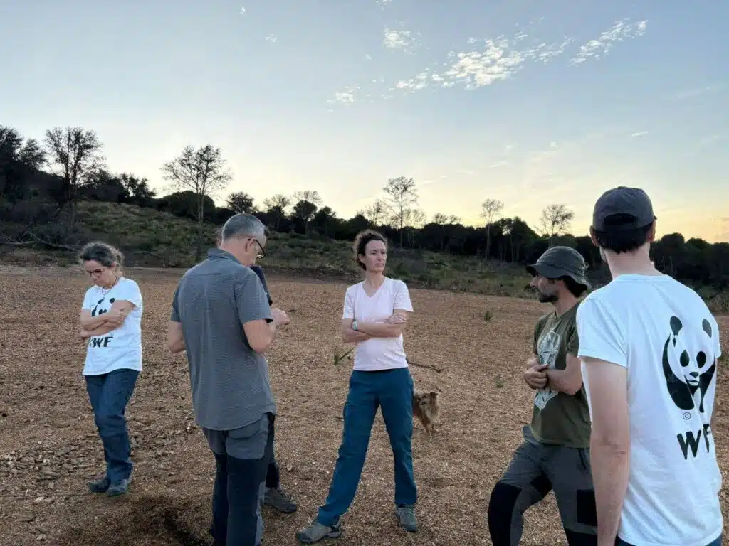 El paisaje de Elche nos mostró una realidad muy diferente. Nos encontramos con un ecosistema semiárido que en muchos aspectos roza lo árido, donde la lluvia es escasa y altamente irregular. Allí, la muerte masiva de pinos fruto de la sequía ha transformado el territorio en una maquia arbustiva muy viva, pero marcada por la ausencia de arbolado. Analizamos cómo esos pinos secos, cuando caigan, generarán futuros nichos de regeneración y cómo integrar la siembra directa enfrentando desafíos como la fuerte presencia de conejo. También trabajamos en ampliar las posibilidades imaginadas y en replantear las prácticas habituales para adaptarlas a esta realidad climática tan exigente.