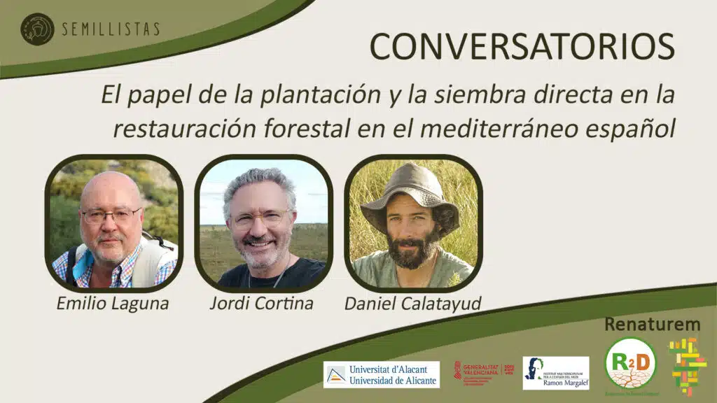 In this new episode, we had the pleasure of talking with Emilio Laguna and Jordi Cortina, as part of the Renaturem project. Together, we addressed a key issue for ecological restoration in the Spanish Mediterranean: the role of planting and direct seeding in forest restoration. We discussed the current status of afforestation and reforestation in Spain, what we understand by successful restoration, and whether planting and direct seeding are mutually exclusive paradigms or, as we argue, methodologies that can and should complement each other.